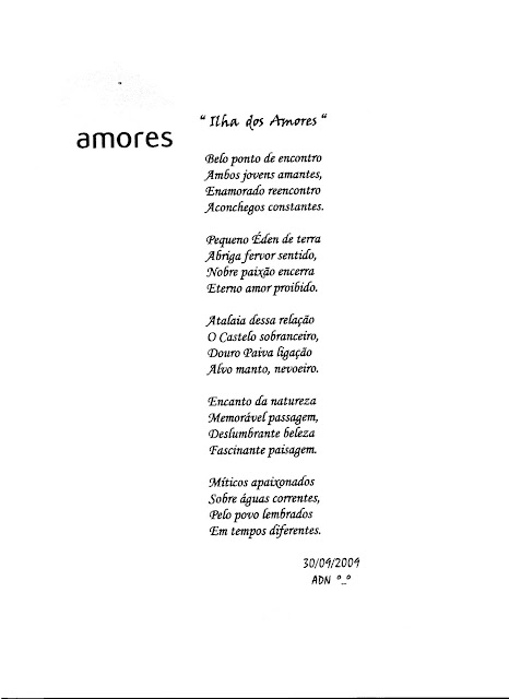 Do poeta deixamos um pequeno texto: “ Ilha dos Amores” de forma simples e poética tentei enaltecer e perpetuar a lenda histórica da ilha, pela qual o povo designa de “ Ilha dos Amores “. Não é mais de que um retrato idílico de toda a beleza do local, referenciando o Castelo lugar e o castelo atalaia (posto de vigia) já desaparecida, focando o Douro Paiva rios e "Douro Paiva" barco rabelo. Menciono o alvo manto, que são os nevoeiros constantes que pela manhã cobrem o leito dos dois rios e que dão um espectáculo lindíssimo para quem vê dos sítios mais altos.