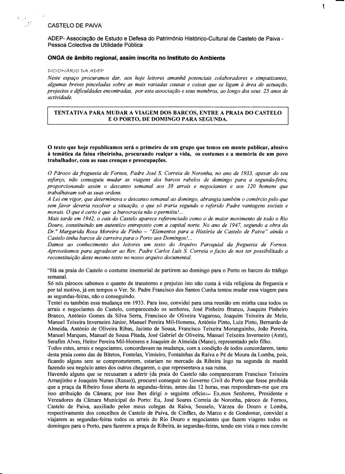 marinheiros, na Régua, o recurso ao Provedor de Justiça, o projecto de parceria
