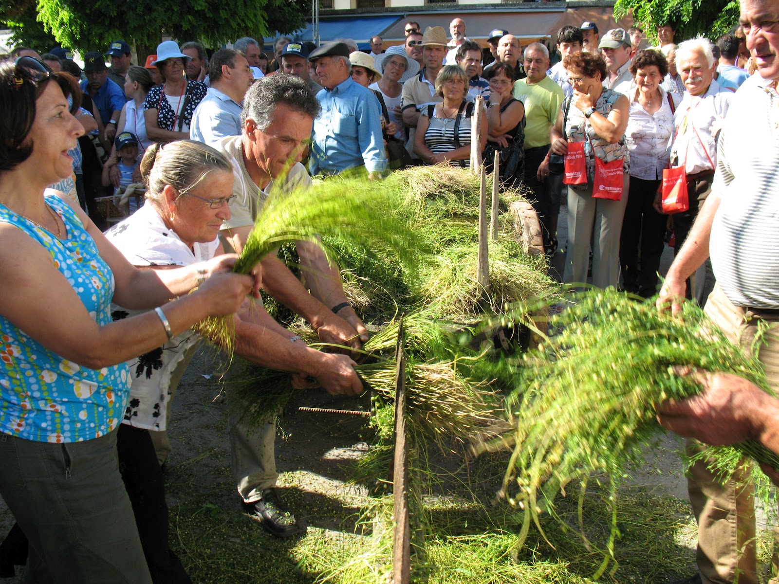 Será assim, vamos arrancar linho, depois vamos ripar-lhe a baganha (semente), como a foto ilustra (numa participação na Feira do Vinho e do Lavrador) e de seguida há-de o caule ficar demolhado no lago.