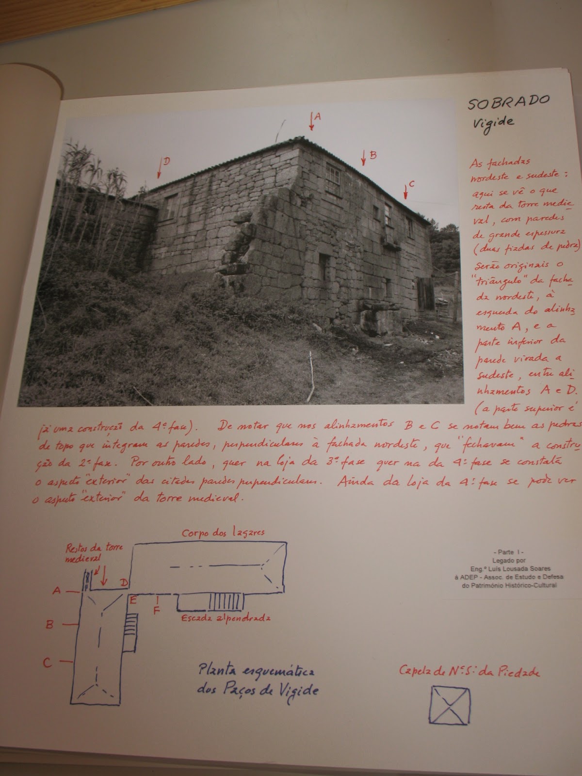 Hoje damos a conhecer um pouco do estudo e da minucia da interpretação das diversas fases de construção e reconstrução da casa da Torre de Vegide. Lousada Soares, neste caso observou, estudou, fotografou e anotou os comentários que se lhe ofereceram e que beneficiam da sua avalisada formação da área da engenharia. Hoje este trabalho constitui um desafio aos nossos historiadores e arqueólogos para as novas abordagens que se impõem.